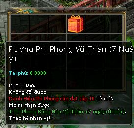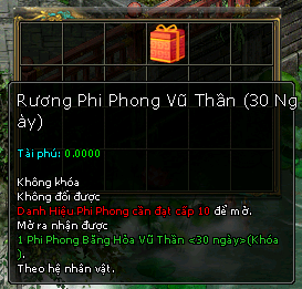 Vật phẩm liên quan : Rương Phi Phong Vũ Thần ( 7 Ngày ) , Rương Phi Phong Vũ Thần ( 30 Ngày )