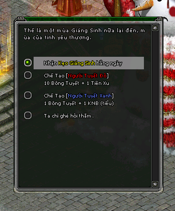 - Các huynh đệ tham gia hoạt động tới NPC Người Tuyết Vui Vẻ đối thoại và chọn : Nhận Kẹo Giáng Sinh hằng ngày