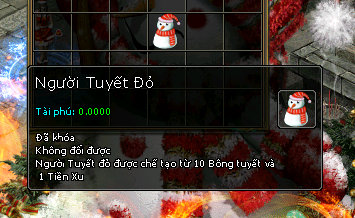 Lưu ý : Cần 5 ô trống để ghép vật phẩm Người Tuyết Đỏ , khi ghép tại NPC Người Tuyết Vui Vẻ Người Tuyết Đỏ vật phẩm sẽ không khóa