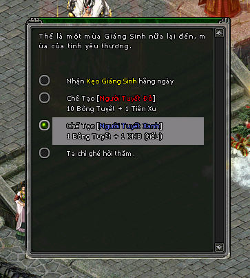 - Các huynh đệ tham gia hoạt động tới NPC Người Tuyết Vui Vẻ đối thoại và chọn : Chế tạo Người Tuyết Xanh
